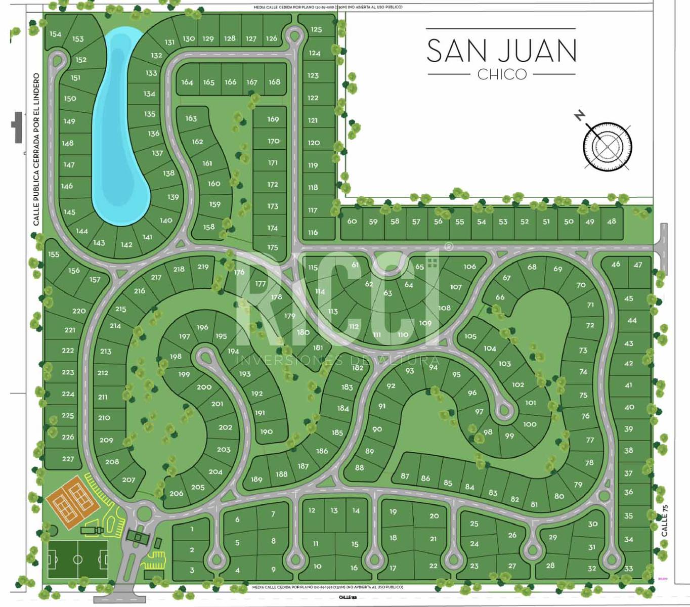 San Juan Chico es un barrio de 227 lotes, de 620 m2 promedio, desarrollado sobre un predio de 25 hectáreas. Servicios de electricidad, agua, cloaca y gas por tendido subterráneo. Asfalto con cordón cuneta. Alumbrado público, pilares de servicios, parquización y edificio de acceso. Sector deportivo con 2 canchas de tenis, cancha de fútbol y salón de usos múltiples (SUM).